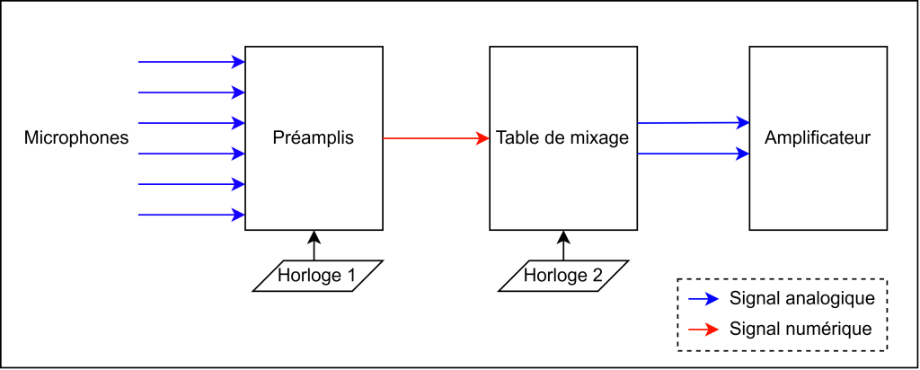 Le problème survient lorsque plusieurs appareils numériques doivent travailler ensemble. Imaginons un préamplificateur qui transforme le son en une suite de chiffres (échantillons) et une table de mixage qui doit recevoir et traiter ces chiffres. Pour que cela fonctionne, les deux appareils doivent être parfaitement coordonnés dans le temps, comme deux personnes qui se passeraient un relais dans une course :
